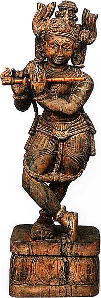 Скульптура представляет бога, стоящего, скрестив ноги, на квадратном постаменте, украшенном лепестками лотоса. У Кришны округлое лицо с крупными чертами, на голове трехъярусная корона (кундалас), традиционная для иконографии Ориссы, в ушах массивные серьги, на шее и груди многорядное ожерелье, на руках и ногах состоящие из бубенцов браслеты. На бедрах персонажа дхоти, его поддерживает богато орнаментированный пояс.