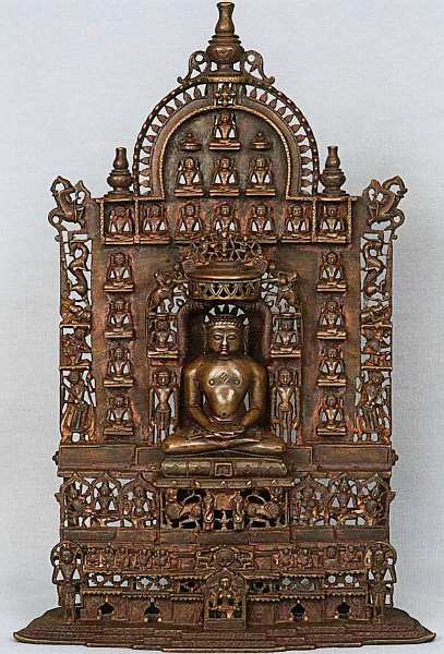 Как известно, пантеон джайнизма включает в себя двадцать четыре вероучителя (тиртханкара). На данном алтаре центральное место занимает второй тиртханкара Аджитанатха. Он восседает в позе падмасана (поза лотоса) с жестом медитации. На груди персонажа знак тиртханкары (шриватса). Аджитанатха сидит на львином троне, который поддерживают слоны, под зонтом, являющимся символом верховной власти. По сторонам от него стоящие в геральдических позах слоны с наездниками.