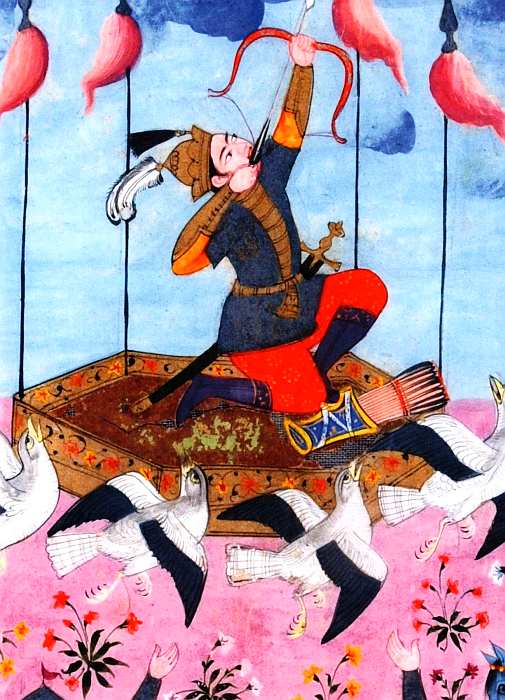 представлен Кавус перед полетом, стреляющий из лука в небо. За ним наблюдают всадники, выражающие различные чувства: от удивления (жест рукой вверх) до сомнения (в задумчивости трет подбородок).
