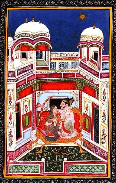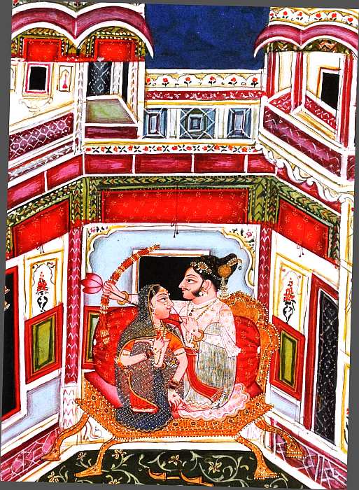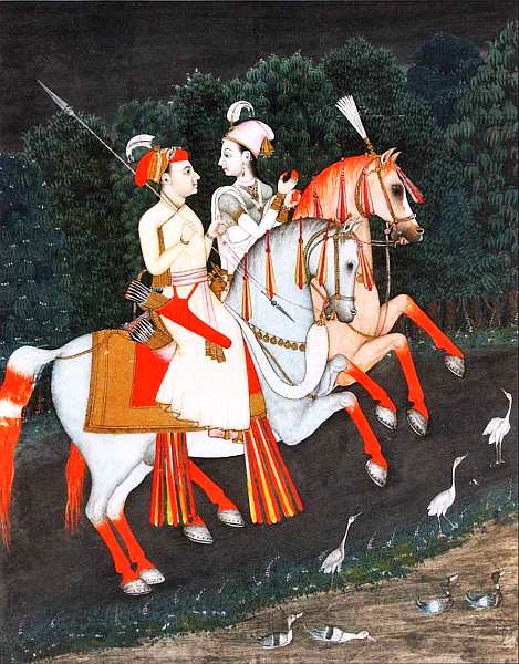 тюрбан с сарпехом (украшением из драгоценных камней), жемчужное ожерелье на груди, серьги в ушах, на полу перед троном его золотые туфли. Девушка влюбленно смотрит на избранника, а он натягивает тетиву и пускает стрелу, наконечником которой служит цветок лотоса. Она должна погасить солнце и остановить рассвет, чтобы герой мог продолжать наслаждаться обществом красавицы.