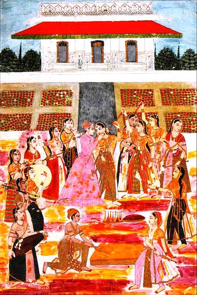 На данной работе изображен праздник весны Холи. Он длится два дня и приходится на полнолуние в период с конца февраля до начала марта. В центре представлена влюбленная пара: юноша, судя по одеянию, принц, а его спутница знатная красавица. Их окружает толпа девушек, играющих на различных музыкальных инструментах. Праздник также сопровождается разбрызгиванием ярких красок (гулал) при помощи специальных трубок. На заднем плане возвышается садовый павильон, перед ним прямоугольные клумбы с красными цветами. Миниатюра передает атмосферу торжества, во время которого людей охватывает страсть, что подчеркивает яркий колорит.