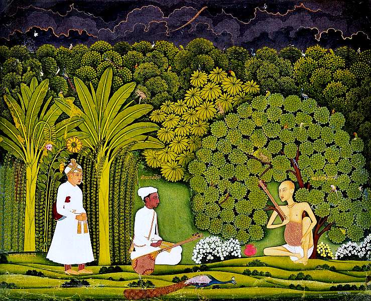 На миниатюре представлена сцена, когда Тансен вместе с властителем пришел к Свами Харидасе. Учитель восседает под деревом в одном дхоти. В руках он держит тамбуру и всецело поглощен божественной музыкой. Подопечный гуру почтительно сидит перед ним и внимательно слушает, Акбар прячется за банановыми деревьями.