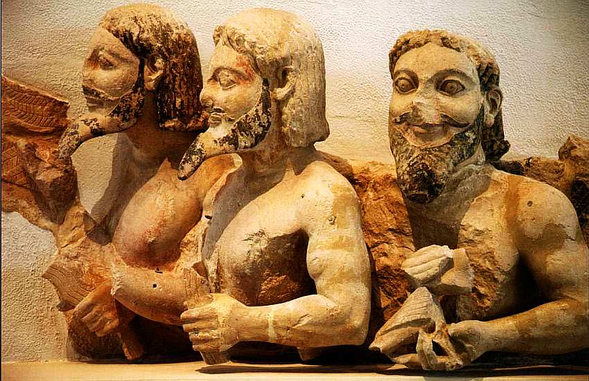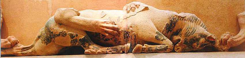Здесь видны характерные черты архаического искусства: нерасчлененность композиции, отсутствие планов, скульптора больше волнует изображение фактического действия, чем то, как будет восприниматься сцена. Важное значение имела окраска в очень яркие цвета, что неожиданно для современного зрителя.