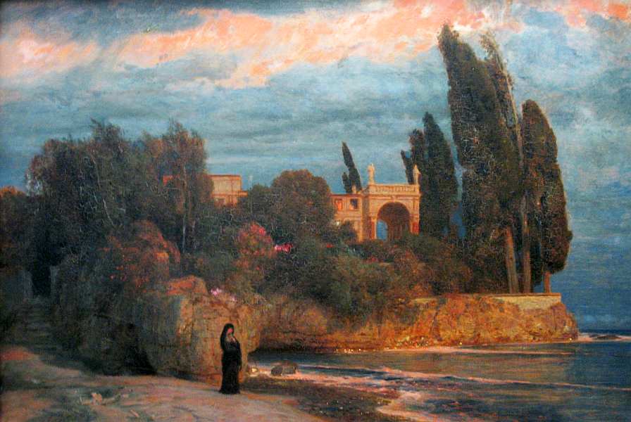 Про одинокую фигуру дамы на берегу моря художник говорил, что это последний потомок древнего знатного рода. Она скорбит о муже, облаченная в траур, молчаливая, погруженная в свои воспоминания. Зритель видит семейный дом, залитый средиземноморским солнцем и окруженный кипарисами, но он опостылел женщине.