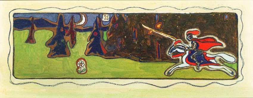 Мастер был увлечен разнообразными поэтическими метафорами и философскими аллегориями. Тема всадника, рыцарей, как можно убедиться, глядя на эту раннюю работу, сопровождала его долгие годы. Рыцарство многозначный и важный образ для европейской культуры: отважные герои немецкого эпоса «Песнь о Нибелунгах», трубадуры и миннезингеры, крестоносцы, богатыри из русских сказок, наконец, святой Георгий в христианстве. Здесь Кандинский экспериментирует с народной традицией, создает картинку для сказки. Сумерки, ночь излюбленный мотив художников еще со времен романтизма, ведь именно тогда происходит все самое интересное и загадочное. Привлекает внимание ярко-красный плащ героя, он горит словно факел в сгущающейся синеве. Время на картине символично: на небе луна, лес скрылся в темноте, а трава, тем не менее, светло-зеленая. Контуры густо обведены, что лишь подчеркивает фантазийный, выдуманный мир образов.