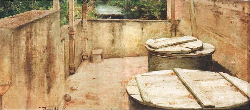 В жарких странах в небольших городках и местечках наслаждаться вечерней прохладой после того, как спадет дневной зной, часто можно на крышах, которые местные жители обустраивают как террасы (не этот ли принцип включил авангардист Ле Корбюзье в свои великие «Пять отправных точек современной архитектуры»). В представленной, на самом деле ученической, картине молодой художник написал такую крышу, однако без присущего французскому вкусу любования окружающим миром. Погашенные цвета металлических баков, обмазки стенок и пола в темных потеках превалируют в колористической гамме. Автор «впустил» сюда лишь немного природы (листвы), как бы углядывая ее в щелки. По основному цвету палитры группу пейзажей Нунеля этого периода называли «Шафран». Данный холст может считаться исключением среди таких работ.
