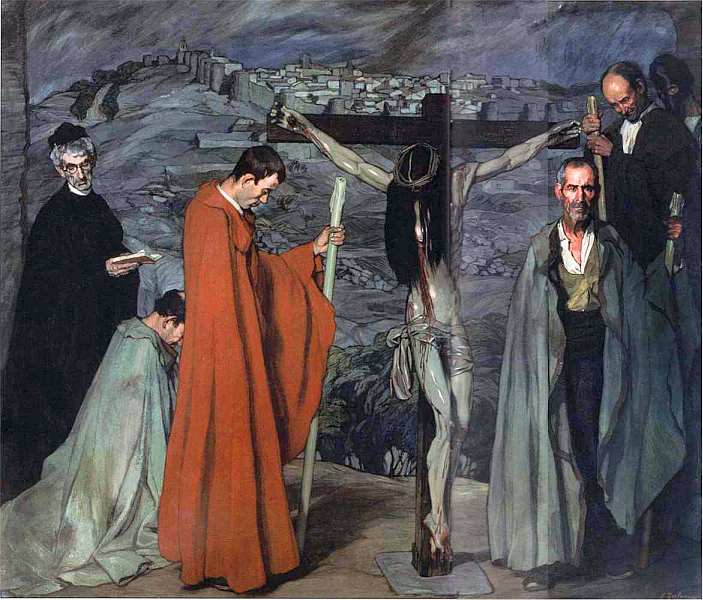 Словно забыв о Карлосе Хасе, Сулоагу называют родоначальником национального пейзажа. В данном полотне его пейзаж, как, впрочем, и в предыдущей картине, выразительно эмоционален. Но если в «Человеке из Сеговии» он воспринимается в реалистическом ключе, то здесь природа мистическая. Характерные лица, застывшие перед свершившимся распятием, существуют в ненастной современности, будто несущей отзвук грозы над Толедо из мира Эль Греко. Линии раскинутых рук Иисуса будто продолжаются в пространстве, вместе с перекладиной креста создавая крепостную стену города, который хорошо виден в далекой перспективе. Это не Иерусалим (хотя оливковые посадки как воспоминания о «молении о чаше» в Гефсиманском саду), а современный испанский городок, охраняемый жертвой Богочеловека. Особенностью художественного дара Сулоаги является умение находить декоративную составляющую в видимом пространстве. Даже в мрачной мистерии багряным плащом персонажа на первом плане не только исполнена символическая функция, напоминающая о пролитой крови, но и произведен удивительно тактичный декоративный эффект.
