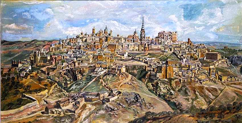 Однако представленный пейзаж не ночной и не грозовой. Скорее, живописец опирался на композицию великого Эль Греко «Вид и план Толедо». На данном холсте над городом только собираются стремительные облака. Панорама небольшого по масштабу Толедо поистине величественна. Художнику удалось передать иллюзию, будто постройки не «сходят» вниз по отлогим холмам, а именно взбираются ввысь, словно устремленные в небеса. Это подчеркнуто готической колокольней самого большого в Испании кафедрального собора. Она, как и в реальности (90 м!), доминирует над пейзажем. Паленсиа очень точен в красках глинистая и песчаная почва, сероватая зелень, погашенное серебро листвы оливковых деревьев. Сложность рельефа, усугубленная геометрией дорожек и тропинок (в Толедо они пролагаются по стокам дождевых вод), крепостных стен и построек почти делает панораму результатом умышленности авангардистского толка.