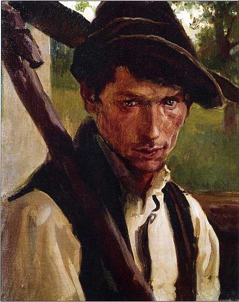 Представленная картина создана еще до отъезда за океан. Молодой косарь (вероятно, земляк художника, галисиец) показан прямо и упрямо глядящим на зрителя. И его орудие, и шапка, сдвинутая набок, подчеркивают остроту характера. В этом простонародном типе мастер сумел открыть сложность душевных переживаний. Психологизм и ненавязчивая изощренность композиции всегда были присущи его творческой манере. (Неудивительно, что живописцу заказали свои портреты президент Аргентины Хуан Доминго Перрон и его супруга.) В год написания холста «Косарь» автор получил первые премии на международных выставках в Барселоне и Буэнос-Айресе.