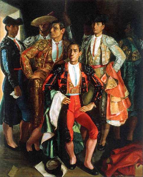 Национальное зрелище Испании, ее «марка», коррида, «бой быков» символ жизни и смерти, победы и поражения, мужества и отваги. Она предстает перед каждым зрителем, будь это в деревне или на столичной арене, парадной стороной, а ее участники рыцарями без страха и упрека. Именно таковой и изобразил здесь квадрилью художник. На холсте доблестные помощники матадора (или новильеро), постоянно действующие рядом с ним на арене, два пикадора, три бандерильеро, оруженосец и сам знаменитый боец из Аликанте Хуан Ортис Сентено в красно-черном костюме, готовый к выходу на публику.