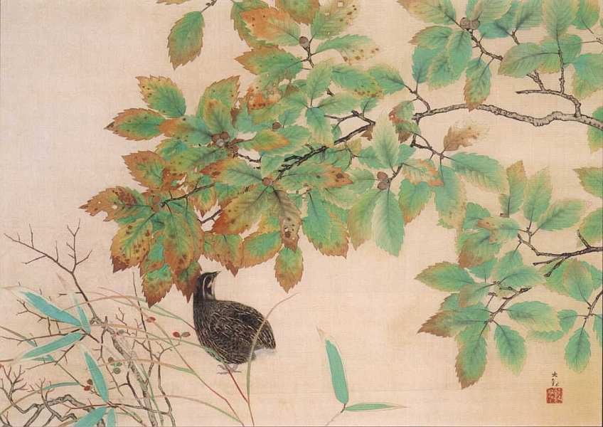 Иокояма Тайкан работал в разных техниках и манерах. Изображая перепела среди трав, под веткой с листьями, слегка тронутыми осенней желтизной, он приглашает зрителя сосредоточиться и увидеть мельчайшие детали, отличающие один лист от другого, стебель сухой травы от ветки сухого куста, и, наконец, с наслаждением осознать, что в природе все красиво по-своему.