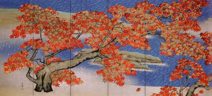 Для парных шестистворчатых ширм, соединяющихся в единую масштабную композицию, художник выбрал осенний сюжет, когда клены становятся багряными. Этот период года японцы выделяют особо, называя его «Осенняя прозрачность» или «Японская ясность». Мощные, полные силы узловатые столы деревьев, красиво вторящие друг другу, вздымаются над пронзительно синей водой, островами, облаками