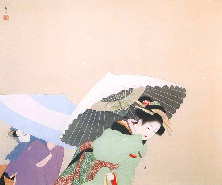 К чему или к кому относится название данной композиции? К медленно падающим хлопьям снега или к таким хрупким красавицам с набеленными лицами, приучившим себя к плавным изысканным движениям, тщетно защищающимся большими бумажными зонтами? Это решать зрителю. Сёэн же еще раз подчеркивает совершенство этой своеобразной, искусственно культивируемой, утонченно женственной красоты, написав свою работу в самый разгар Второй мировой войны.