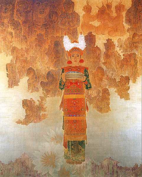 Изящно скомпонованные и условно, но с виртуозной убедительностью прописанные рельефы помещены за спиной юной жительницы острова. Сонм буддийских божеств возникает, как облако, как золотисто-янтарный мираж. Их коснулась неумолимая рука времени. Юная красавица, будто парящая над землей, одета в нарядный, яркий костюм для ритуального танца и головной убор, украшенный белыми цветами. В ее руках коробочка для подношений, а у ног не лотосовый трон, как у буддийского божества, а белые цветы лотоса.