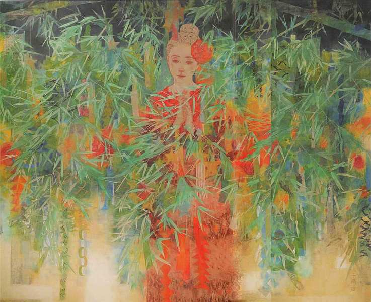 Как и другие мастера японской школы нихонга, он использует традиционную бумагу васи, минеральные и растительные пигменты, растертые в порошок, органический клей как связующее. Краски в отличие от фабричных «западных» не смешиваются, и лишь добавление воды меняет оттенок и тон одного и того же пигмента. Мазки, наносимые в процессе высыхания, привносят элемент импровизации. Любопытно, что Масааки работает в технике, известной в Японии еще с IX века. Ее особенностью является то, что краски наносятся с оборотной стороны листа, с изнанки, это дает очень интересный эффект.