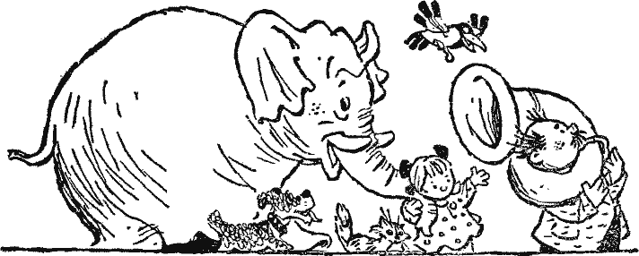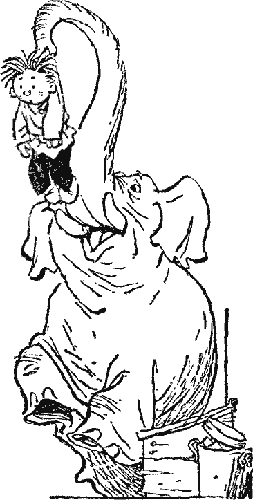 Том, подумав, протягивает Петьке хобот. Петька горячо его пожимает. Жильцы ликуют. Трубач играет на трубе туш. В это время Том ложится на бок и начинает храпеть.
