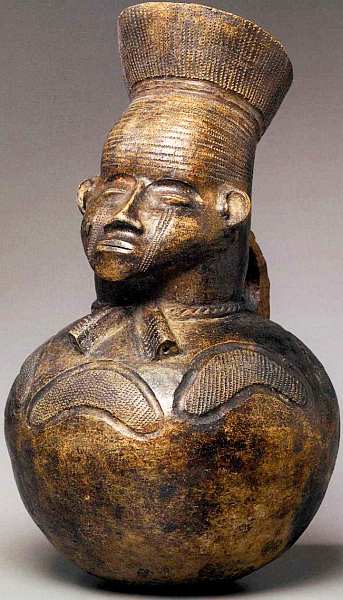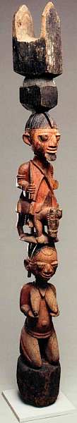 фигур женская над мужской кажется, более оправданно в отличие от представленного. Как колонны подпирают определенные архитектурные конструкции, так резные фигуры, из которых они состоят, поддерживают и оберегают морально, а, может быть, как считали аборигены, и физически хозяина такого жилища. Следовательно, это не просто произведения искусства, они несут и некий символический смысл. Более того, если сравнить данные скульптуры с трактовкой фигур на блюде для пальмовых орехов, также происходящем из ареала, населяемого йоруба, можно смело говорить о совершенно определенном и самобытном пластическом стиле названного народа.
