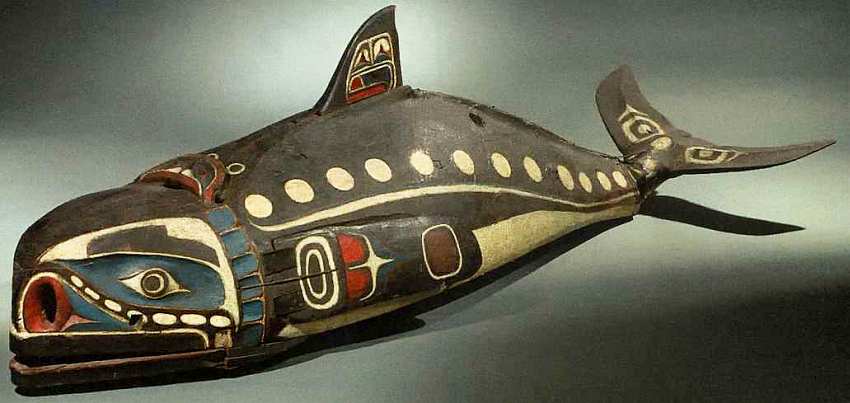 Большая часть деревянного барабана декорирована резьбой, которая первоначально была окрашена в белый и красный цвета. Вырезанное на корпусе лицо вызывает ассоциацию с маской: высунутый язык выражает угрозу противнику и свидетельствует о силе клана, владевшего этим музыкальным инструментом.