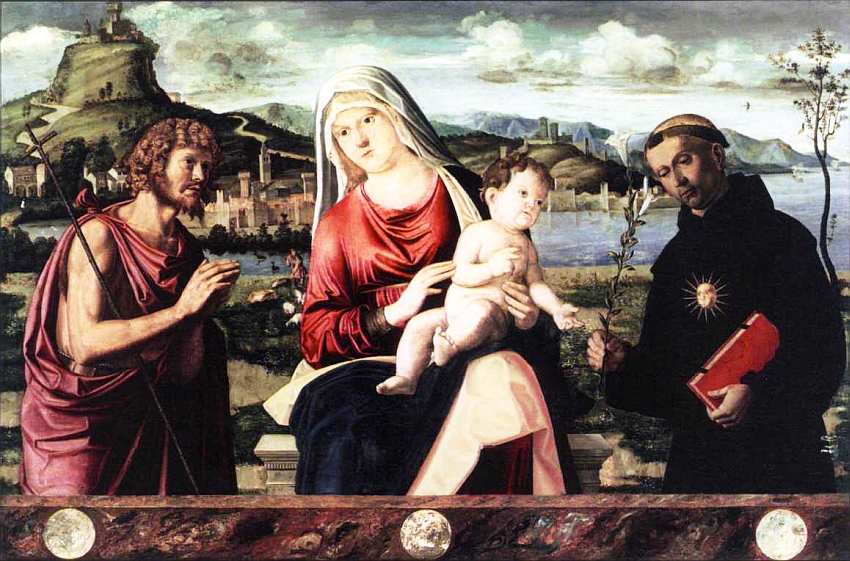 Выбор для «собеседования» именно Николая Толентийского можно объяснить тем, что он являлся одним из покровителей Венеции может, и не родины художника, но, во всяком случае, города, с которым тот был профессионально связан. Еще более конкретная причина изображения святого на картине то, что он считался защитником от чумы. Известно, что в конце XV начале XVI века Венецию потрясло несколько эпидемий «черной смерти». Больных свозили на остров Лаззаретто-Веккьо, где был устроен первый чумной лазарет. Можно предположить, что если на заднем плане дан вид Венеции, то место на переднем, отделенном проливом, и есть названный остров, на котором столь желательно присутствие Николая Толентийского. Но все это, конечно, представлено художником (если предположения вообще верны) весьма условно.