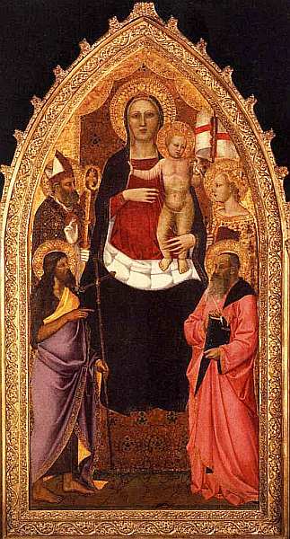 Данный алтарный образ был создан, вероятнее всего, для Дуомо (кафедрального собора), отсюда выбор святых. На переднем плане два тезки Иоанн Креститель и Иоанн Богослов с традиционными атрибутами. Креститель с тростниковым крестом указывает на Младенца Христа и в этой мизансцене, безусловно, произносит свою главную фразу: «Ессе Agnus Dei» (с латинского «Вот Агнец Божий»). Иоанн Богослов предстает здесь именно как евангелист, то есть автор четвертого Евангелия, а также «Откровения»: он преклонного возраста и со знаком учености книгой (именно в его Евангелии содержатся приведенные слова Крестителя). Вторая пара святых тоже неслучайна: они являлись покровителями Флоренции. Репарата дева-мученица из Кесарии, умершая, как считается, во времена преследования христиан при императоре Деции в III веке. Она была святой старого кафедрального собора в городе, пока на его месте не воздвигли новый (1293). Из ряда ее атрибутов в данном случае выбран стяг с белым полотнищем и красным крестом символ Воскресения, опять-таки ввиду эпидемии чумы. Зиновий (умер около 417), еще будучи молодым человеком, обратился в христианство и стал епископом Флоренции. Он изображен с епископским посохом.