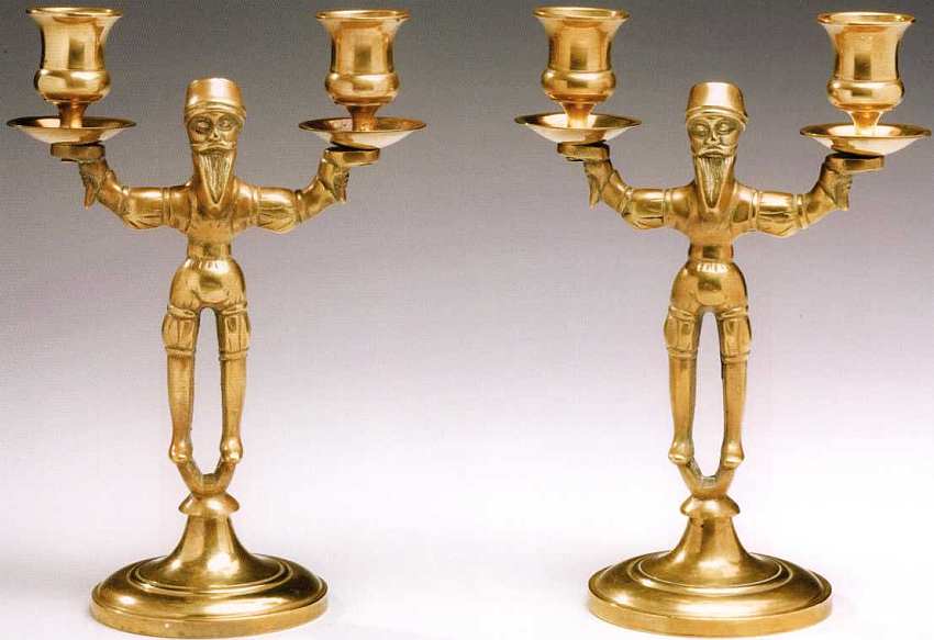 Подсвечники, выполненные в виде человеческих фигур, выделяются из ряда подобных изделий. Хотя Тора не говорит четко о недопустимости фигуративных изображений (запрет распространяется только на создание идолов для поклонения), тем не менее еврейская традиция с большой осторожностью относится к запечатлению человека, тем более в объемной скульптуре. Факт, что в виде фигур выполнены предметы, непосредственно связанные с заповедями иудаизма, свидетельствует о достаточной просвещенности заказчиков. С одной стороны, видимо, их будущие владельцы недостаточно строго относились к законодательным тонкостям веры, а с другой, вероятно, для них было очевидно, что эти «человечки» как ничто иное далеки от образа, которому можно поклоняться.