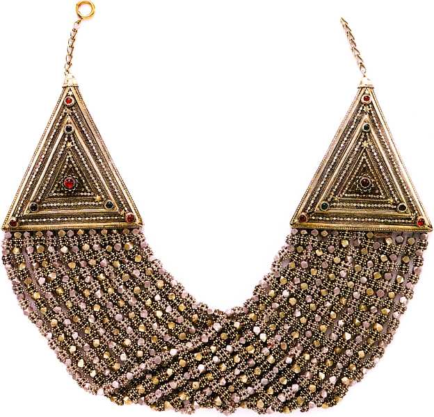 Одним из наиболее распространенных традиционных занятий йеменских евреев было ювелирное дело, чаще всего изготавливали серебряные украшения. Массовый отъезд евреев в 1949-1950-х фактически лишил страну целой «касты» ювелиров. Данное изделие имеет черты, характерные для ближневосточной традиции: к примеру, перекрест нитей ожерелья посередине и треугольные элементы, к которым они прикреплены. Такие украшения девочки и взрослые женщины Саны носили по праздникам. На обратной стороне треугольников начертан некий текст, возможно, магического характера. По всей вероятности, он записан значительно позже, чем изготовлено само ожерелье.