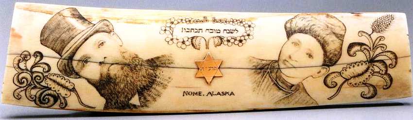 Данный предмет сочетает еврейскую традицию и ремесло аборигенов. В еврейской среде распространен обычай дарить поздравительные открытки на Новый год (Рош а-Шана). Эта «открытка» на моржовом клыке, по всей вероятности, выполнена инуитским мастером, прозванным Счастливый Джек (настоящее имя Ангокважук). На ней еврейская семейная пара (люди одеты в соответствии с принятой модой, женщина в парике), которая проживала в этих краях и держала магазин. Изображение сопровождается традиционным текстом на иврите: «Да будете вы записаны на хороший год, 5671 [1910]». Счастливый Джек, как и большинство эскимосских умельцев, был неграмотен и не умел писать (ни на каком языке). Однако он превосходно имитировал и шрифт, и западный стиль в целом.