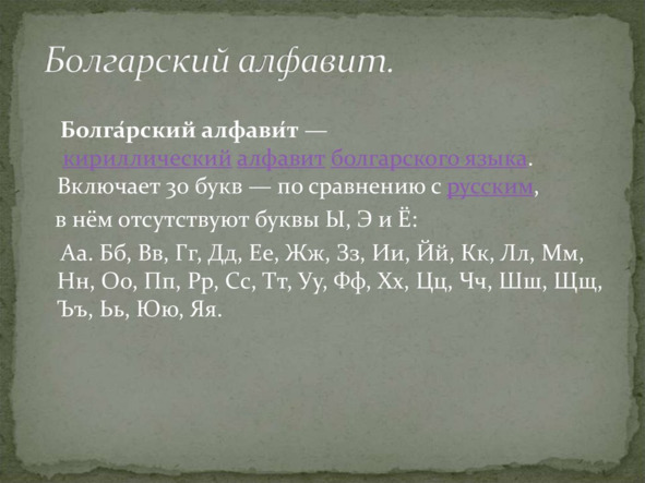 Болгарский алфавит состоит из 30 букв, которых являются кириллическими