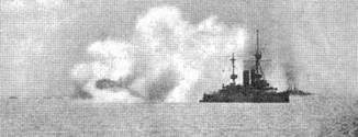 Броненосец Канопус выходит на учения (вверху), во время стрельб в 1904 г. и в Дарданеллах в 1914 г.