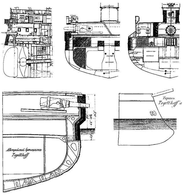 Броненосец Tegetthoff" (Продольный разрез в районе кормы, поперечные сечения корпуса и наружный вид носовой части)