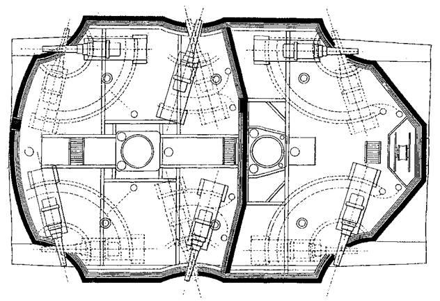 Носовая пара орудий была отделена от остальных броневым траверзом, проходящим позади первой дымовой трубы и выгнутым в сторону носа (чтобы не мешать повороту средней пары орудий). Погреба боезапаса находились непосредственно под орудиями.