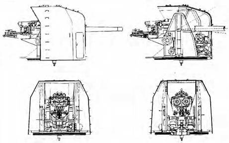 Основные характеристики новых автоматов были следующими: длина ствола в калибрах 65; вес ствола 68.5 кг; вес установки 2330 кг; угол возвышения +90°; угол снижения -10°; начальная скорость снаряда S25 м/сек: дальность стрельбы 6100 м (по морской цели), 2900 м (по воздушной цели); вес снаряда 1 34 гр.: скорострельность 220 выстрелов в минуту для одного ствола. Здесь приведены итальянские данные о вооружении крейсеров типа Ди Джуссано". Но в литературе можно встретить и другие данные по малокалиберной зенитной артиллерии. Так. Кондотьери А" до июня 1940 г. вместо 2 40-мм имели 8 37-мм автоматов, в 4 спаренных установках. (Conway's АН the world's Fighting ships 1922-1946. tp. 292; M.J. Whitley Kreuzer im Zweiten Weitkrieg.150).