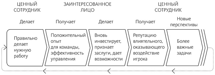 Итак, возникает нарастающий цикл инвестиций со стороны заинтересованных лиц, который экспоненциально увеличивает возможности и ресурсы ценных сотрудников и делает их вклад поистине невероятным. Однако они не занимаются бесконечным повторением какого-то выигрышного рецепта: с каждым кругом они учатся, адаптируются к меняющейся среде и все более умело конвертируют вложенные ресурсы в ощутимые плоды. Этот простой, но мощный цикл становится похож на беспрестанно усложняющуюся инвестицию, где небольшие непрерывные оценки и поправки со временем приводят к существенному изменению результата.