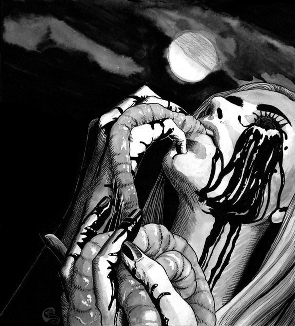 Потрошителя была разорвана в клочья. Брюки с трусами болтались на уровне ковбойских сапог. Скальпированная, уже успевшая выдрать второе веко, вцепилась клещами в нижнюю губу и наслаждалась его жутким визгом. Камнеметчица стояла перед ним на коленях, терзая живот с явным стремлением добраться до кишок. Осклизлая отгрызла правый сосок, с наслаждением прожевала и проглотила. Освежеванная опустилась на колени возле его лица, собрала с груди горсть опарышей и затолкала ему в рот. Он больше не мог кричать, только задыхался и хрипел.