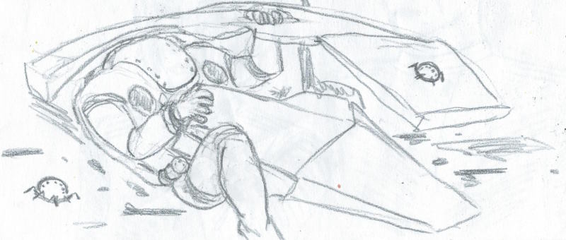 А у нижней части машины, как бы между ног была кабина 2-го пилота, увенчанная парой легких роторных орудий «Кикан-джу». В какой-то момент Брод почувствовал как нечто твердое, надавив на броне-пластину, прижало его к крыше. Сам он этого никак не ощутил, но датчики экзо-костюма передали ему эту информацию. «Похоже по мне сейчас идет 2-й пилот». Брод уже изготовился резким движением сбросить того с крыши и навалиться на 1-го в 4-х метрах от него, но Джим тут же придержал. «Это кто-то другой. Второму нужно сюда карабкаться». Выждав с минуту, Брод увидел этого 2-го пилота. Это была женщина с черными прямыми волосами. Она стояла спиной к нему и показывала что-то коренастому. Они разговаривали в живую и ИИ костюма Брода тут же начал транслировать все в мозг.