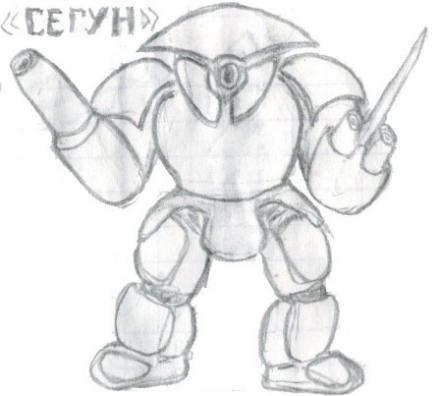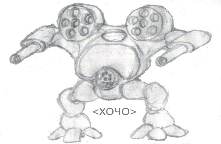 Правее шел 42-тонный 4.5-метровый «Хочо». Это был очень опасный робот, вооруженный двумя барабанами гиперзвуковых РПУ по 6 пусковых трубок в каждой, ультра РРП пушкой и двумя орудиями Гаусса в руках.