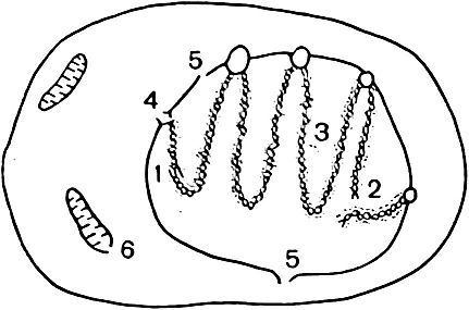 9. Схема наиболее важных локализации лучевого поражения клетки. 12 одиночные и двойные разрывы ДНК; 3 нарушение связи ДНК с белком; 4 нарушение структуры ДНК-мембранного комплекса; 5, 6 нарушение ядерной и митохондриальной мембран