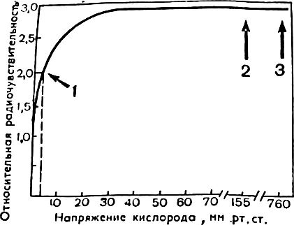 их в атмосфере, содержащей 10% О2 и 90% N2 сообщил в 1950 году Лимпероз. В лаборатории Э. Я. Граевского, где изучаются механизмы радиочувствительности и ее искусственного изменения, М. М. Константинова подтвердила эти данные и детально изучила зависимость защитного эффекта от содержания кислорода в экспериментах на мышах и крысах. Оказалось, что отчетливый, но слабый (ФИД ~ 1,2) защитный эффект наблюдался после снижения концентрации кислорода во вдыхаемой смеси до 910% (т. е. вдвое по сравнению с его содержанием в воздухе 21%) и сильно возрастал при уменьшении концентрации до 75%. ФИД составлял около 1,5. Из этих экспериментов был сделан вывод, что животные в условиях недостатка кислорода, или, как говорят, в гипоксии, переносят облучение примерно в полтора раза больших дозах, чем при облучении на воздухе.