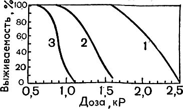 Рис. 16. Кривые выживаемости мышей при облучении их на воздухе (кривая 3) и через разное время после помещения их в условиях гипоксии 6% О2 и 94% N2 1 через 5 мин; 2 через 20 мин. ФИД равен соответственно 2,5 и 1.5