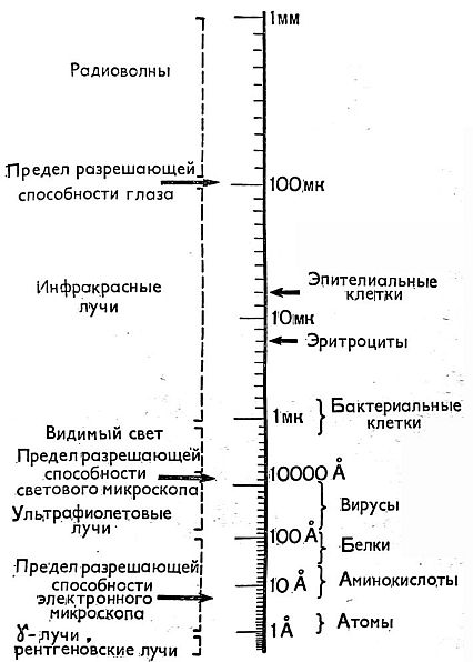 Рис. 1. Спектр электромагнитного излучения. Для наглядности приведены размеры атомов и биологических микрообъектов.