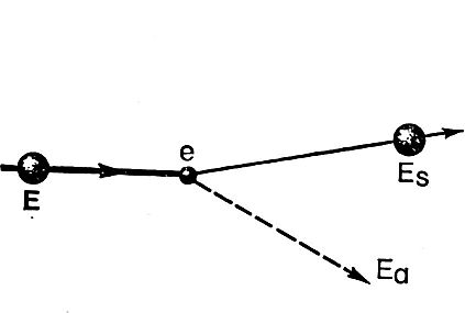 Рис. 2. Комптон-эффект. Падающий фотон с энергией Е испытывает соударение с электроном е, приводя его в движение и сообщая ему энергию Еа. Остаток энергии Es = =ЕЕа уносится рассеянным фотоном