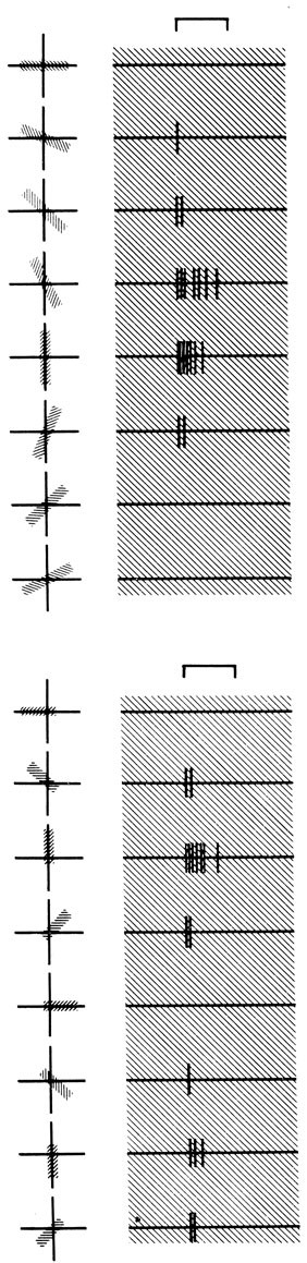 Рис. 12. Один из своих основных экспериментов Д. Хьюбель и Т. Визель провели на одиночных клетках зрительной коры головного мозга кошки. Здесь показана электрическая активность одной клетки, возникающая в ответ на изменения простого зрительного раздражителя - линии, ориентированной под разными углами к горизонтали. Глаз кошки видит линию (серую), и в данной клетке мозга возникают разряды (спайки активности) в зависимости от ориентации этой линии
