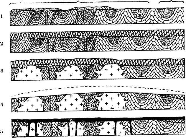 На пятом рисунке потоки порфиритов (изверженная порода) залили всю поверхность и опять погребли обнажения гранитов.