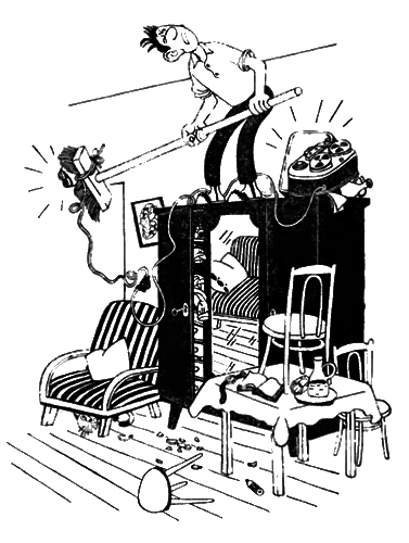 Я стоял на шкафу, приложив ухо к потолку. Внезапно раздался оглушительный треск, и я свалился вниз. Наверху затарахтел мотоцикл.