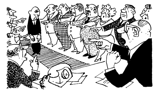 В кабинет, строго соблюдая старшинство, гуськом вбегают первый, второй, третий заместители начальника и один просто заместитель; кучей втискиваются восемь старших помощников и за ними два просто помощника.
