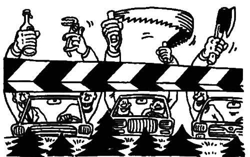 И точно однажды видит Семенов: возле шлагбаума петля из автомобильных шин проложена. Объезд незаконный устроили моторизованные потребители природы. Плюнул со злости Семенов и, сняв свой фирменный пиджак с зелеными веточками в петлицах, поработал от души топором, дотачав шлагбаум увесистыми бревнами и перекрыв тем самым незаконный объезд. А вот ночью проснулся с ощущением смутной тревоги. Встал, свесил с кровати босые ноги, поразмышлял о том, что бы это могло значить. А потом будто кто повел его туда, к шлагбауму. Посветил Семенов фонариком так и есть, и достроенное им уже успели объехать. И снова Семенов взял в руки топор, и перегородил новую незаконную колею.