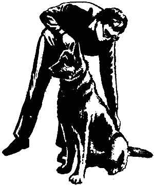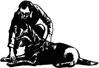 Второй способ отработки навыка с помощью лакомства. Усадив собаку около себя, у левой ноги, дрессировщик делает полуоборот налево и, отставляя правую ногу в сторону, левой рукой берет собаку за поводок у ошейника. Затем, взяв в правую руку лакомство, он подносит его к морде собаки и, подав команду «лежать!», постепенно опускает руку с лакомством вниз, оттягивая ее несколько вперед. Как только собака, потянувшись за лакомством, ляжет, следует отдать его, одновременно удерживая собаку в этом положении левой рукой, лежащей на холке собаки. Путем повторения этого приема добиваются безотказного выполнения собакой команды «лежать!».