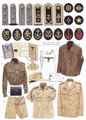 Каждый военный в Рейхе имел собственную «собачью бляху» медальон с личным номером (22). Известно множество вариантов медальонов, отличных по форме и стилю. На флоте медальоны часто золотили. На данном медальоне выбита группа крови, буква «N» обозначает Nordsee флот Северного моря (вариант «О», Ostsee или Балтика). Медальон переламывался на две части. В случае гибели моряка одна часть медальона оставалась на теле, вторая изымалась для регистрации. Самой популярной одеждой подводников была короткая куртка (23), очень похожая кроем на британские военные куртки. Знаки различия и награды на куртках подводники носили всяк на свой лад. Здесь есть офицерские погоны и металлический нагрудный орел. Легкая рабочая куртка изображена на рисунке 24. Нарукавные шевроны на таких куртках могли быть, а могли и не быть.