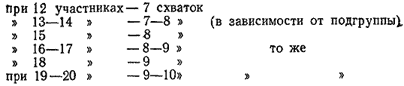 Иногда соревнование проводится по круговой системе с выбыванием после определенного числа проигранных схваток. Заранее учесть, сколько будет схваток при данной системе розыгрыша, трудно. Но можно предположить, что на таком соревновании схваток будет на 1/3 меньше, чем при круговой системе.