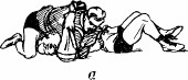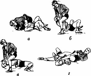 Если вы находитесь возле левого бока противника, сцепившего руки и упирающегося в ковер предплечьями и коленями, то, захватив двумя кистями левое предплечье противника, ложитесь на левый бок и упритесь в Плечевую часть его правой руки ребром своей левой подошвы. Правую ногу перекиньте через туловище противника и отожмите ею его голову. Используя свою становую силу и таща левое предплечье противника на себя, разъедините его руки. Разъединив руки, проведите перегибание локтя при помощи ноги сверху (рис. 4.)